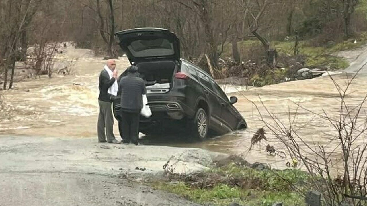 Köy yolu kapandı, otomobil suya kapıldı